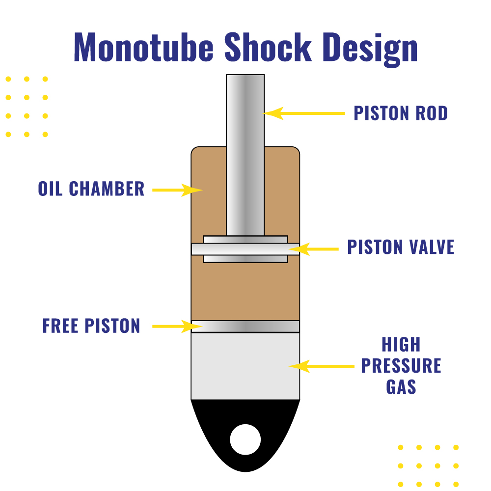 A monotube shock has a single cylinder with a floating piston separating the oil chamber from a high-pressure gas chamber (usually nitrogen).